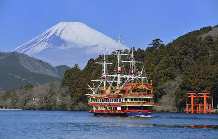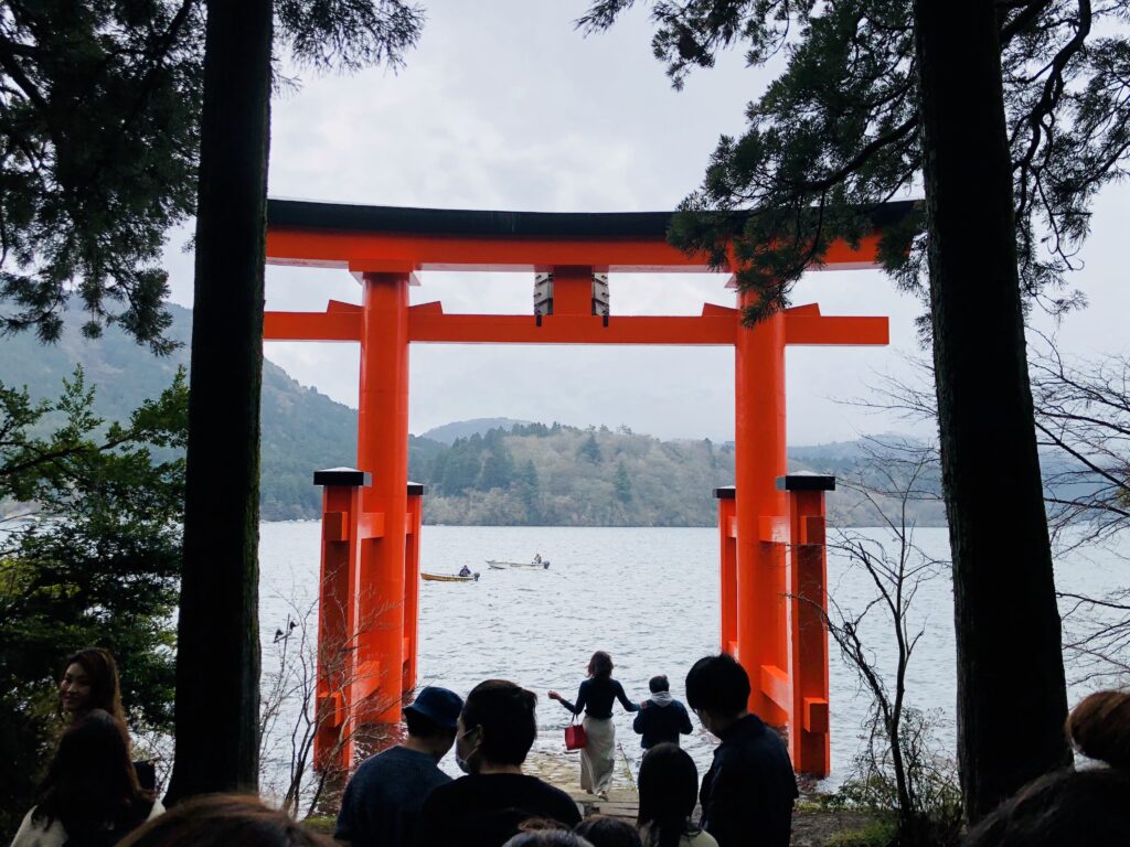湖に立つ赤い鳥居は、箱根を代表する景色のひとつです。