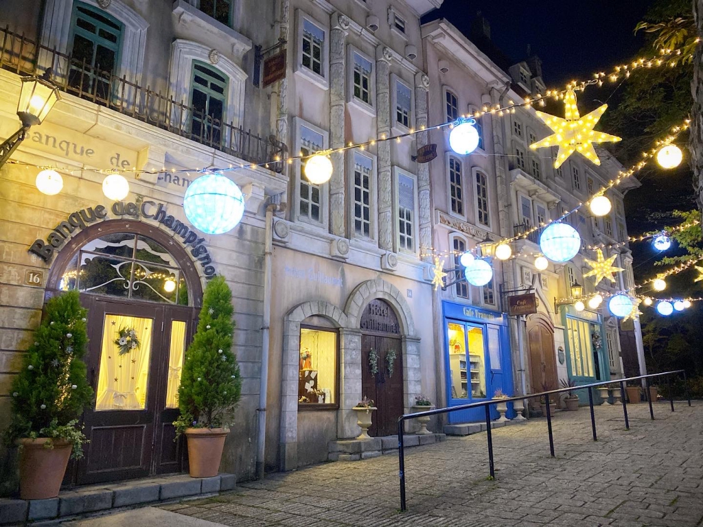 絵本のような建物とライトアップが織りなす光景は、まさに異世界のよう。